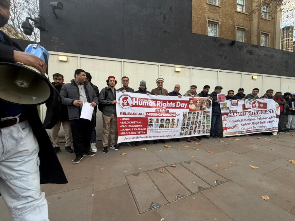 On International Human Rights Day, the Jeay Sindh Freedom Movement (JSFM) staged a major protest outside 10 Downing Street, the official residence of the British Prime Minister, to draw global attention to Pakistan’s deepening crisis of enforced disappearances, extrajudicial killings, and the suppression of ethnic minorities.